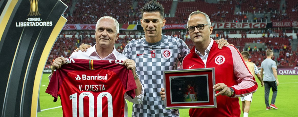 Victor Cuesta recebeu homenagem da diretoria do Internacional pelos 100 jogos atuando pelo clube. Antes da partida contra o Palestino (CHI) no Beira-RIo, pela quarta rodada da Copa Libertadores da América 2019, o argentino ganhou uma camisa e um quadro alusivos à marca atingida.C...
